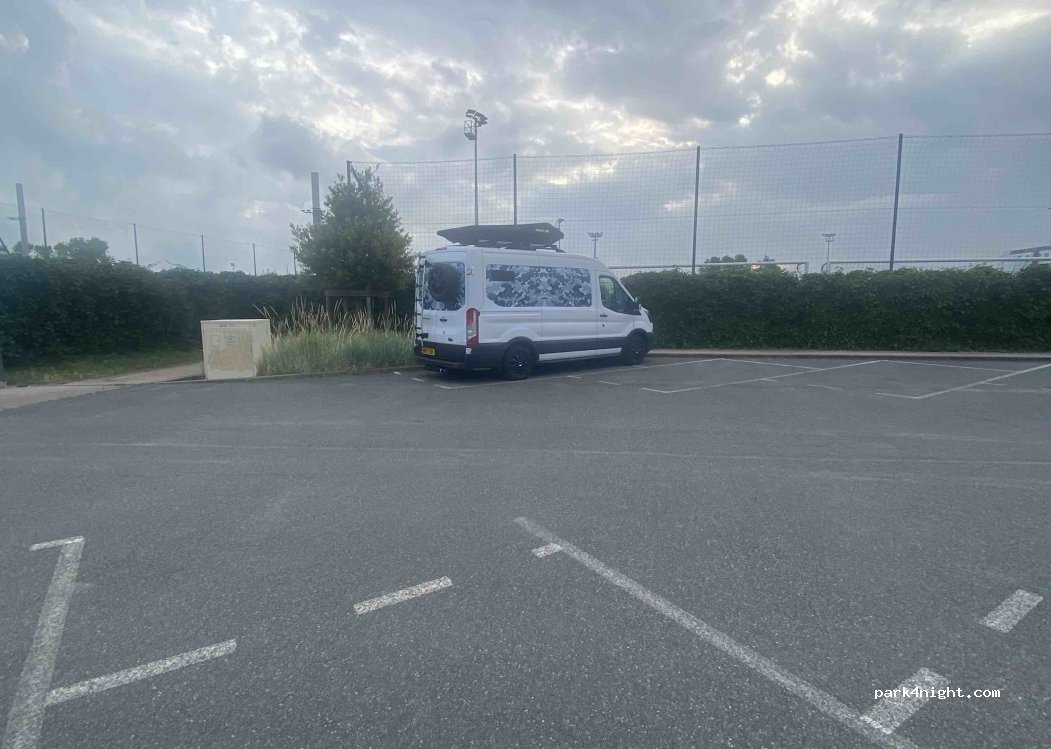 Football club car park. Nice and safe and quiet. We stayed just one night with no problems. Close to the beaches and a few shops. Police drove past us and didn’t bother us. Great little overnight stop over.