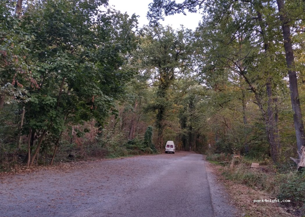 lots of room for our 7.5m camper van. nice and quiet in the forest. interesting bird calls (owl?), restaurant nearby, some dog walkers and joggers in the evening and morning, but we had the entire area to ourselves when we woke (Monday morning) -- for us it was just the right mix of secluded but not totally solitary