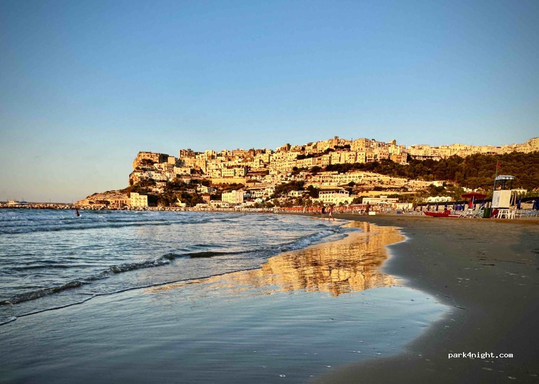 Peschici au bout d’une route en lacets serrés du nord. Peu d’emplacements, plus simple en septembre. Refus pour 1 nuit, accepté pour 3. Douches chaudes payantes (jetons au bar), prévoir papier et savon. 2 machines à laver (6 € avec sa lessive). Piscine, plage et superbe coucher de soleil sur la ville. Bel arrêt malgré tout.