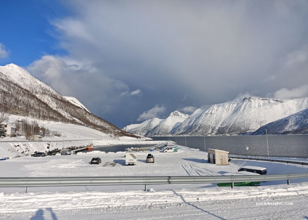 Größerer und relativ neu wirkender sowie zu bezahlender Parkplatz am Hafen. Für viele Autos, Camper und Wohnmobile. Mit sehr moderner und täglich geeinigter Toilette. Perfekter Ausgangspunkt für die Wanderung zum Segla und Hesten. Bei uns war kaum etwas los, daher auch relativ ruhig die Nacht. Blick in die Bucht ist schön. 24/7 Shop, ganzjährig offen in der Stadt vorhanden.