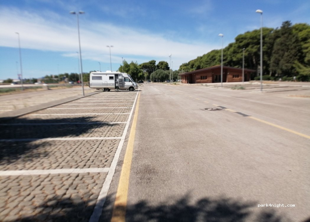 Immense parking à proximité d'une pinède au-delà de laquelle se trouve la petite mer de Tarente. Un peu isolé la nuit. Illuminé. Stationnement relais. Beaucoup de mouvement jusque tard. Toilettes publiques ouvertes en journée.