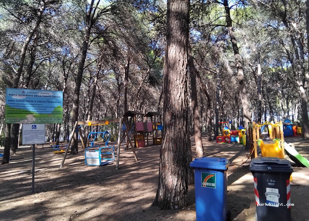 Ampio parcheggio nei pressi di una pineta oltre la quale c'è il piccolo mare di Taranto. Un po' isolato di notte. Illuminato. Parcheggia e parcheggia. Molto movimento fino a tardi. Bagno pubblico aperto durante il giorno.