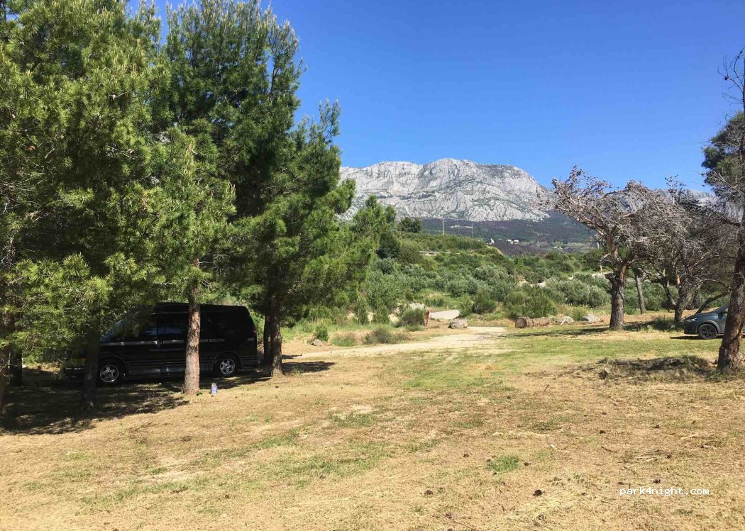 Ampia area piatta sterrata con alberi alti che fanno ombra. vicino 5min a piedi dalla spiaggia di un hotel di Tucepi con servizi liberi per i bagnanti. oppure ci sono dei sentieri che vanno verso il promontorio fino a Makarska con delle belle spiagge libere in piccole baie riparate.