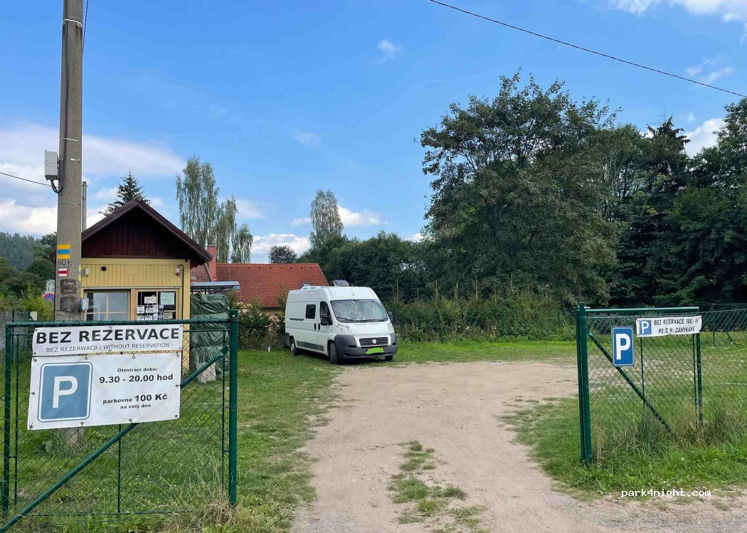 Cheap parking space only suitable for smaller motorhomes. It costs 100 CZK for the whole day, to be paid via a machine (card or cash). From here, the trail is easily accessible via the bridge. Where the trail officially starts, someone from the park is standing to check tickets. You can buy tickets for the trail online.