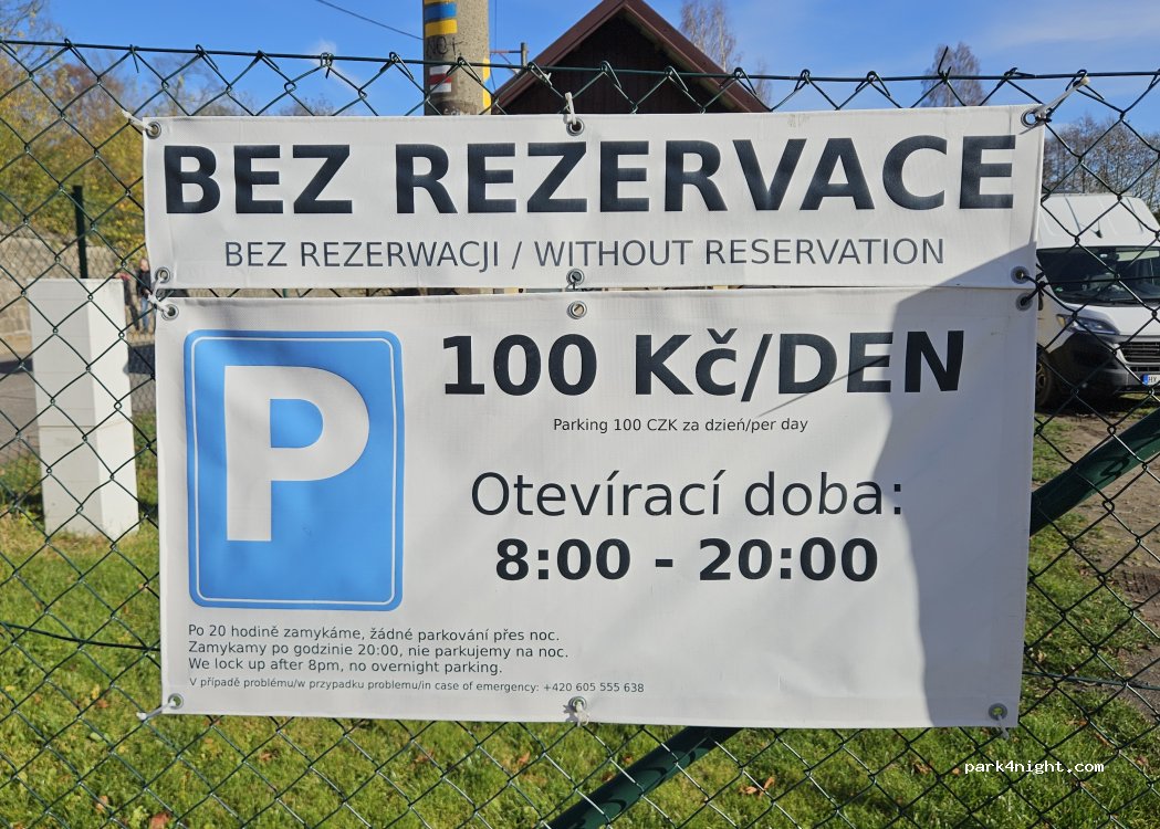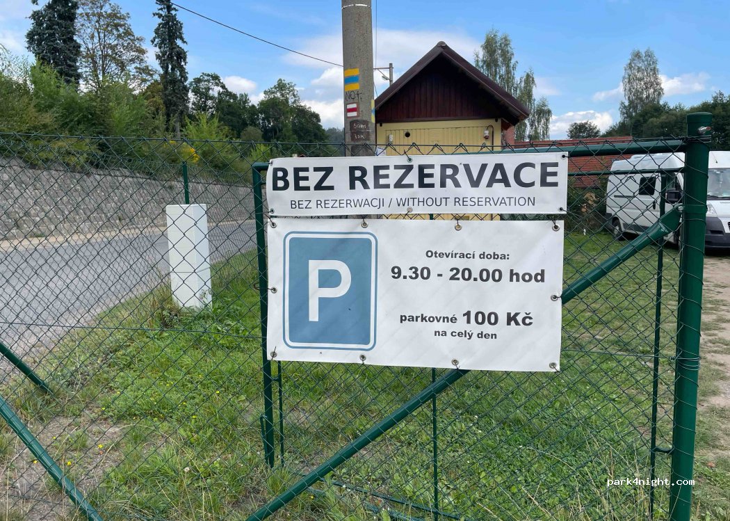 Goedkope parkeerplaats alleen geschikt voor kleinere campers. Het kost 100 CZK voor de hele dag, te betalen via een automaat (kaart of cash). Vanaf hier is de trail makkelijk bereikbaar via de brug. Waar de trail officieel start staat iemand van het park om tickets te controleren. Je kunt tickets voor de trail online kopen.