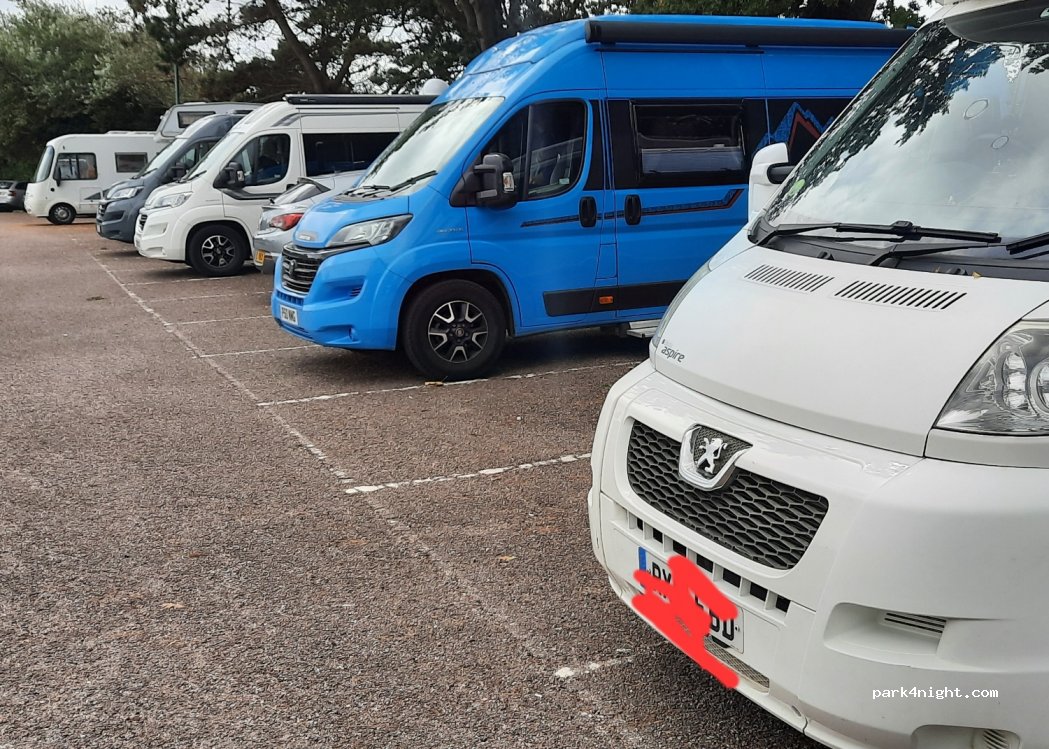 Long-stay car park. No dedicated Motorhome bays but a few back on to grass where it’s possible to overhang. Would be tight for a coach built but OK for campers/panel van.