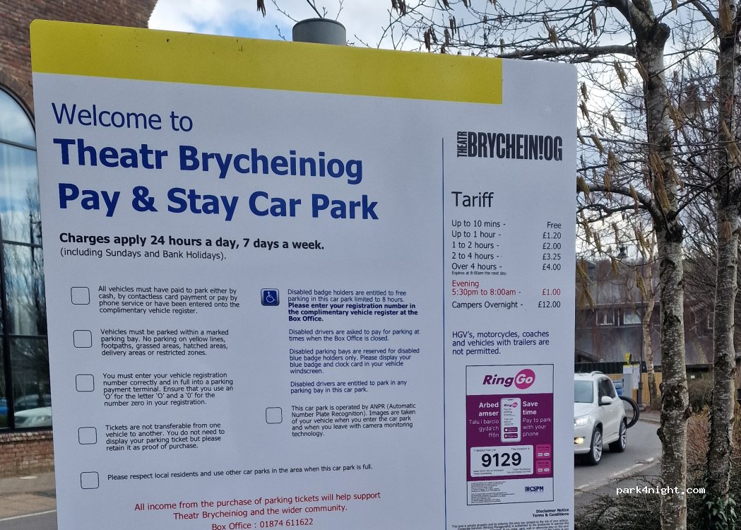Motorhomes can stay over night for £12 - says to park within bays so may only be 12 or so spaces where overhang allowed us to par k(7.4m motorhome). Close to theatre, canal, Aldi and short walk to Brecon.