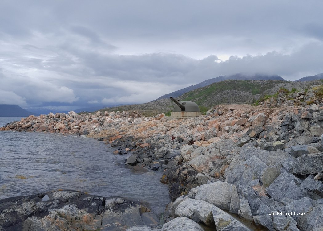 Small remote parking lot, unpaved but easy road. Super quiet with nice view on the bay. Old canon still in place.