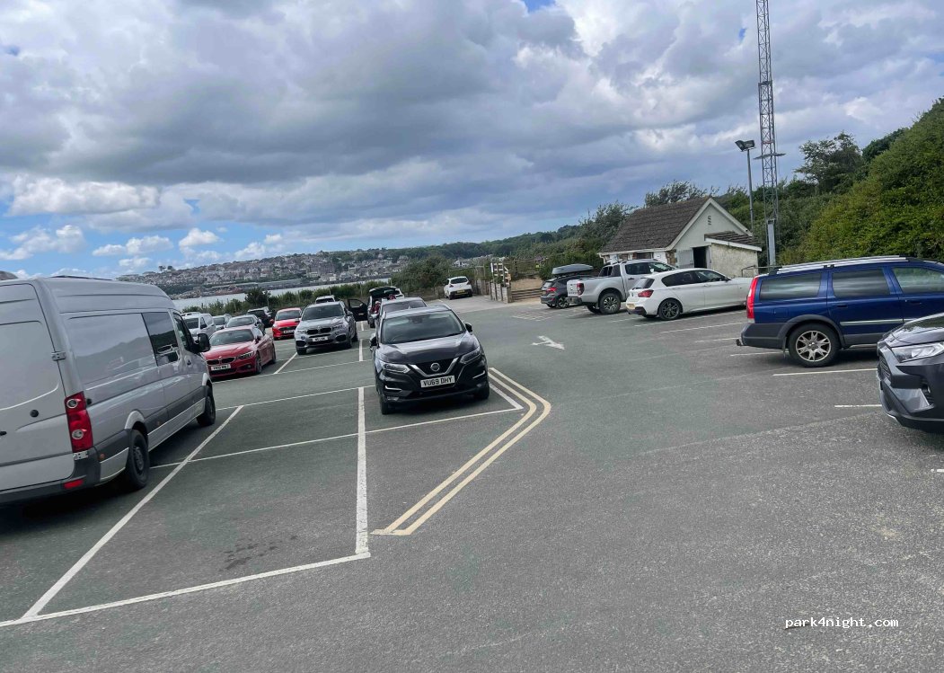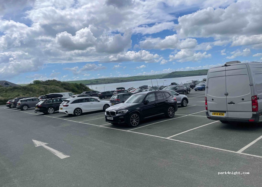 Stayed over with one car ( who occupiers slept over). Toilets open from 7am till 7pm. Big dog walking area, so few cars come and go until dark. Quiet night sleep. Caught ferry to Padstow in the morning. Car park attendant arrived in the morning and was very friendly. Pubs and restaurants next door but the area is very high end, so we just kept to ourselves. Great walk on the estuary.