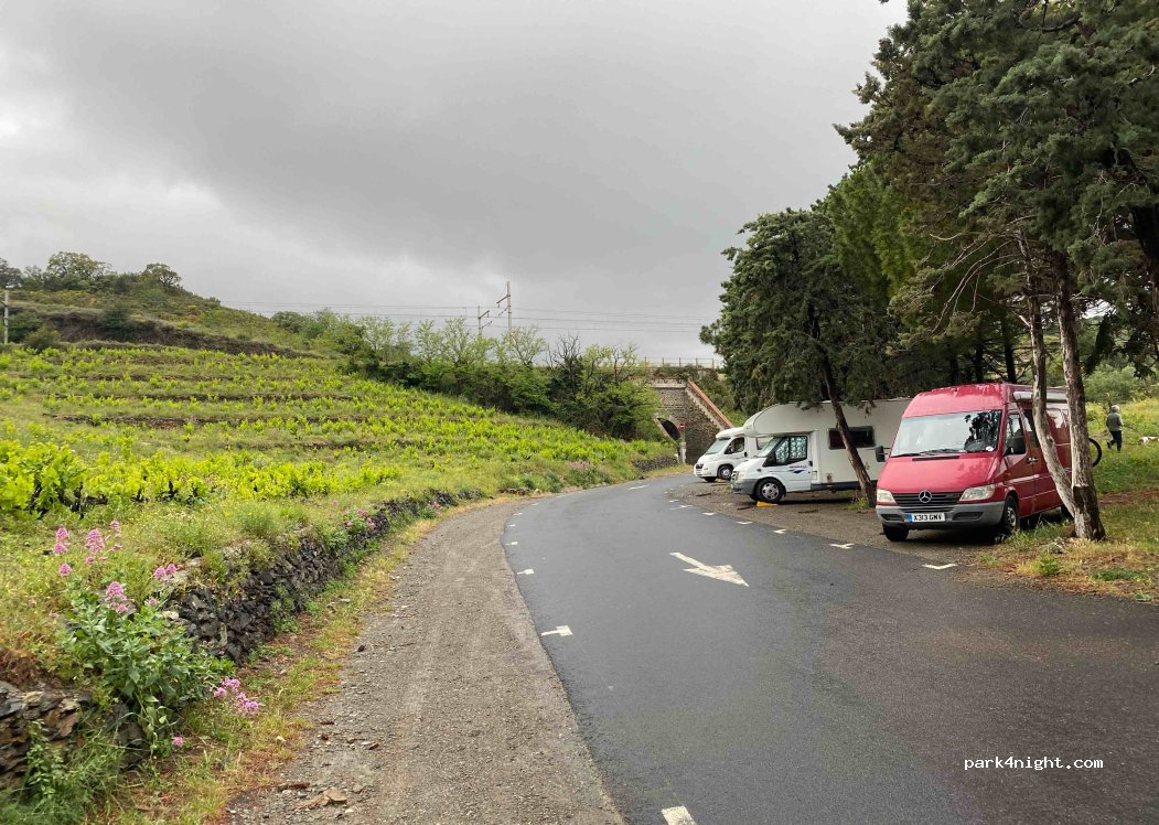 C'est un parking juste à côté de la route entre les vignes et la mer. Les places sont délimitées par des poteaux en bois. Il y en a en diagonale sous les arbres pour 6,5 m de KFZ et d'autres sur le côté d'affilée. En face se trouve une cave où vous pourrez déguster du vin et manger au restaurant ou faire des emplettes dans la boutique. À environ 5 à 10 minutes de marche le long de la route (marquée), se trouve une baie pour la baignade, la plongée en apnée ou le kayak. Il n'y a pas de panneaux interdisant les nuitées.