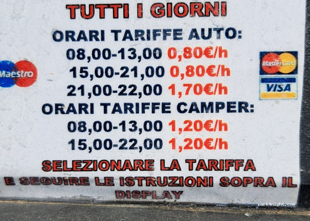 Ottimo parcheggio a pagamento con tariffa camper dalle 21 alle 02 : 2,50 ad ora , dalle 09 alle 21 : 1,20 ad ora