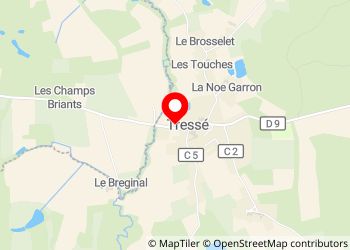 In the village of Tressé next to the town hall, garbage cans, public toilets, restaurant next door, Mesnil forest and megaliths covered walkway