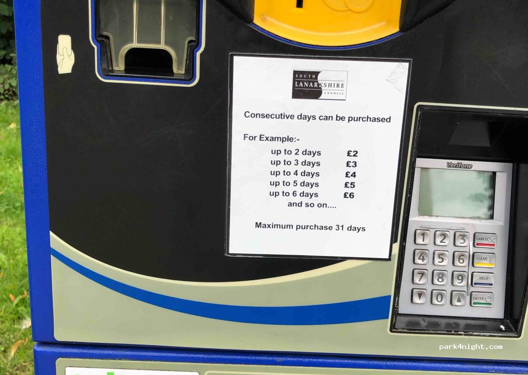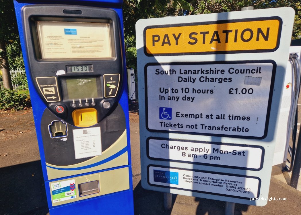 Parking Park and ride, car Park. tarif pour 1 jour ou 2 ou 3. Pour nous de mercredi 18h à vendredi 18h, tarif 2 p Train pour Glasgow à 200 m, au tarif de 2.4 aller retour ... Petite ville tous commerces et sympa à 300 m. certes bruit du train ... mais tranquille. on se sent en sécurité, caméra sur parking. adresse mail indiquée, il faut contourner les bâtiments, le parking est derrière.