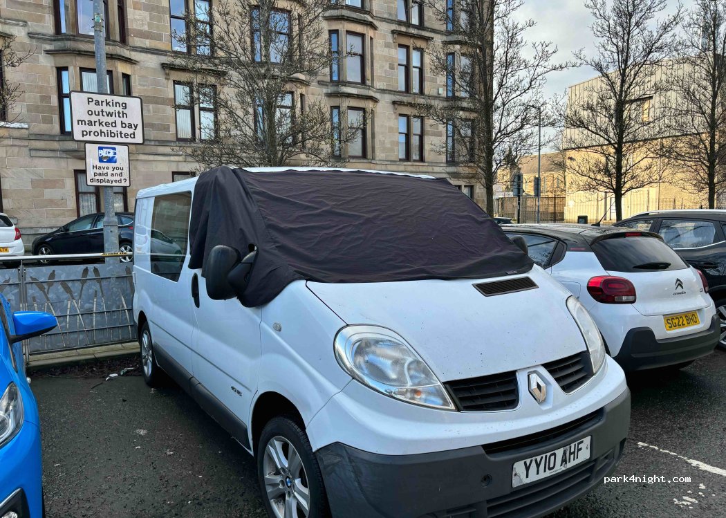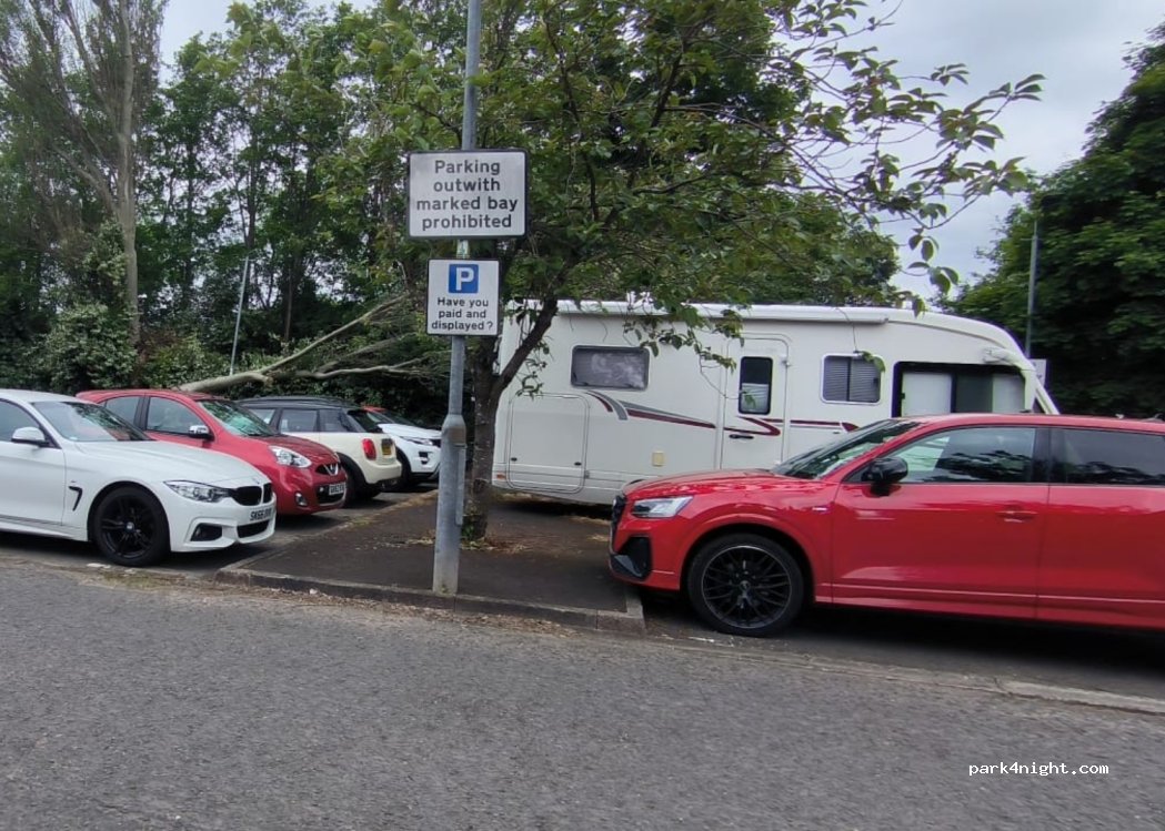 Excellent location! LWB can park hanging over grass verges etc to stay in the space. The general area isn’t amazing but the parking felt really safe, streetlights, cameras, residential area. £1 parking all day 8am-6pm and free overnight. 3 other campers here with us for a few days. £2.50 train into central Glasgow only a short walk away