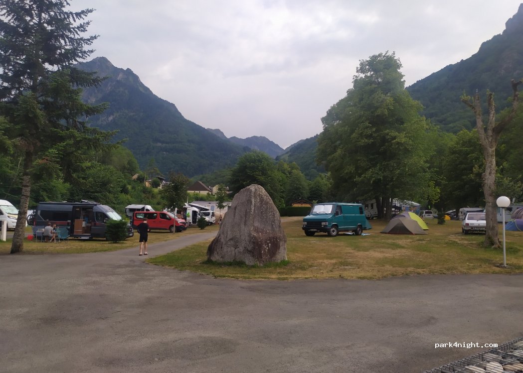 Large campsite just before Cauterets along the gave on the right. Spacious pitches on lawn but mostly without shade. Chocks almost mandatory but some Pitches are flat. Clean toilets. Large play area for children and covered barbecue area. Cauterets 15 minutes on foot by greenway or free shuttle during school holidays.