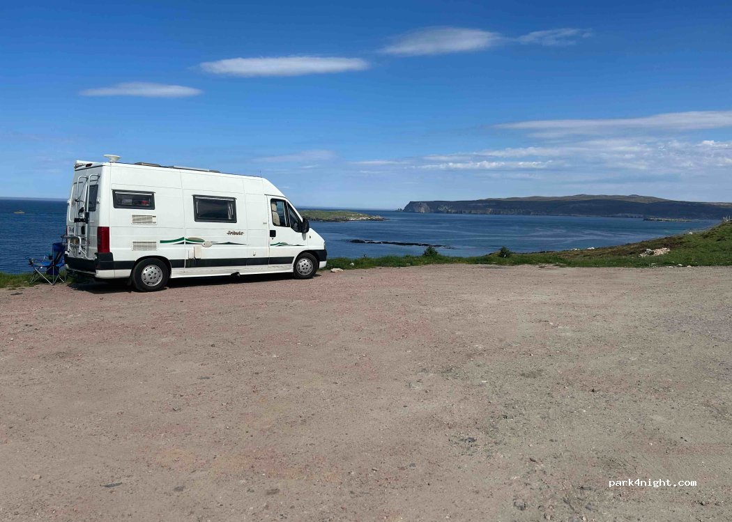 Outstanding views for £10 park up in honestly box. Public toilets very clean and not far away. A stone throw away from smoo caves. 7pm and road is quiet