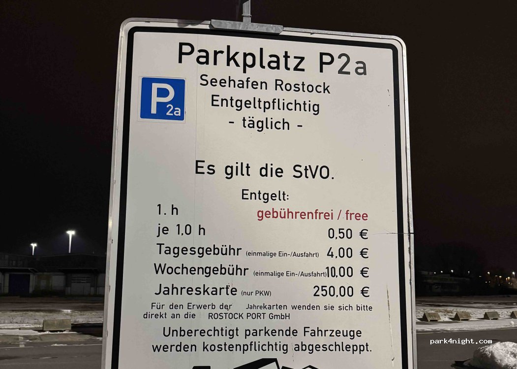 4 euros for an overnight stay at the ferry carpark. The correct place to stay is either the car park marked on Google as 'Parkplatz P2 Seehafen Rostock' or 'Parkplatz Seehafen Rostock'. You are not allowed to stay in the car park marked 'Stellplatz für Wohnmobile', although many do. Our stay in 'Parkplatz P2 Seehafen Rostock' was very quiet and highly recommended if catching the early ferry.