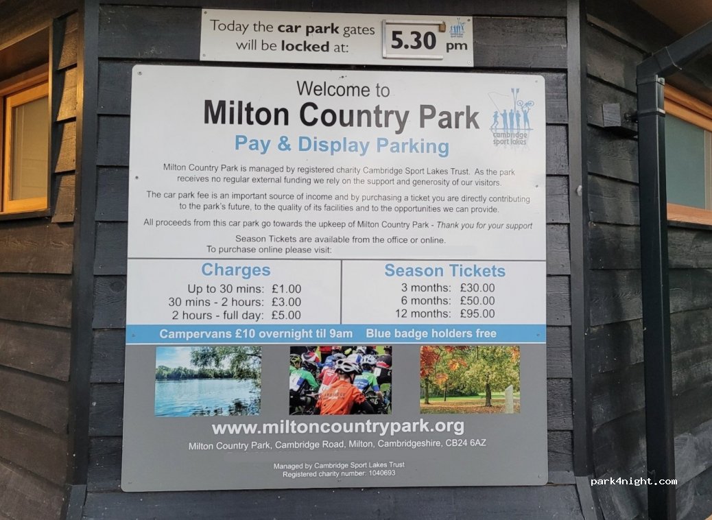 Brilliant little stop. Car park of Milton Country Park welcomes motorhomes for a £15 overnight fee. Get in before 7pm then they lock the gates & toilets. Excellent peaceful sleep then woke up to masses of birds singing. Good clean Toilet block opens at 8am. Park Cafe opens at 9:30. Tesco supermarket & bus stop to Cambridge both 5 mins walk. Staff very friendly. Security cameras on site for safety