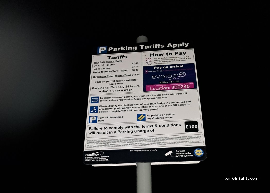 Utter rip off. £6 to park for day parking and then £15 to park between 10pm and 7am. It’s a muddy car park. We left.