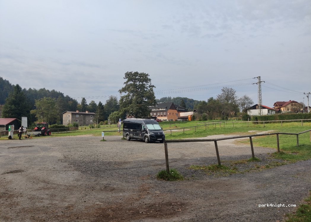 150CZK/24hrs. Possible with credit card at machine. Great base for walking up to the 2 main viewpoints. Mariina Skala and Vileminina vyhlidka. Camping forbidden overnight from 2000 I think.