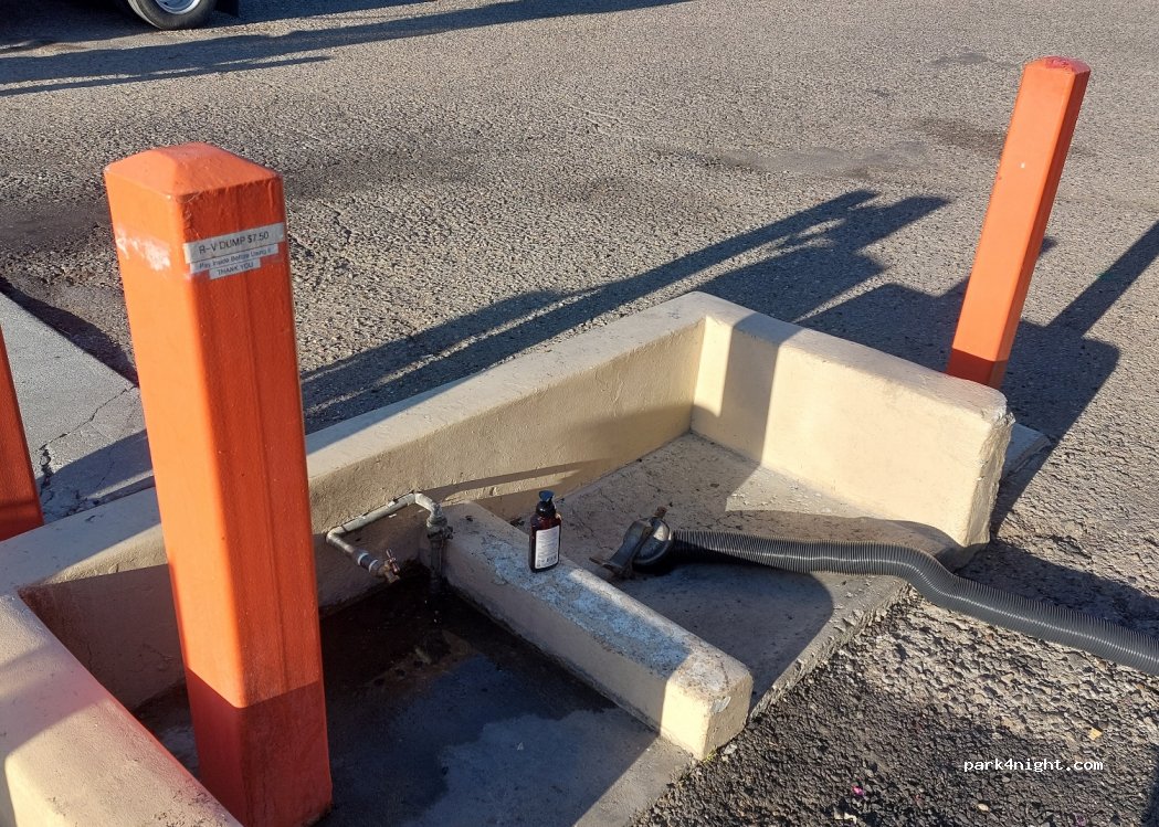 Pay RV dump station at gas station 76. It costs $7.50 to dump power. open from 7.00 AM to 10.00 PM