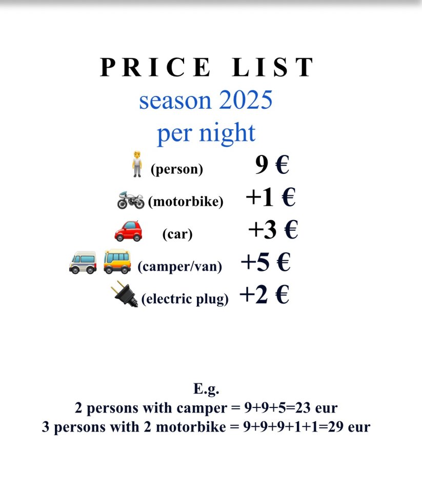 Season 2025 - Per night - 9€/person, +1€ Motorbike, +3 Car, +5 van/camper