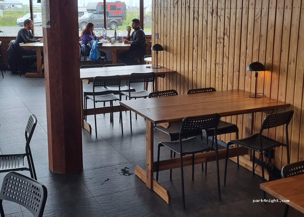 Attention tout ferme à 22h30! On a fait une heure de plus exprès pour la douche. On nous a tout fermé au nez. Salle commune aussi. On était sous la pluie. Dommage. Sinon parking gigantesque complet aucun charme. Salle commune et sanitaire grand et propre. Attention douche payante aussi. 300isk/5min.