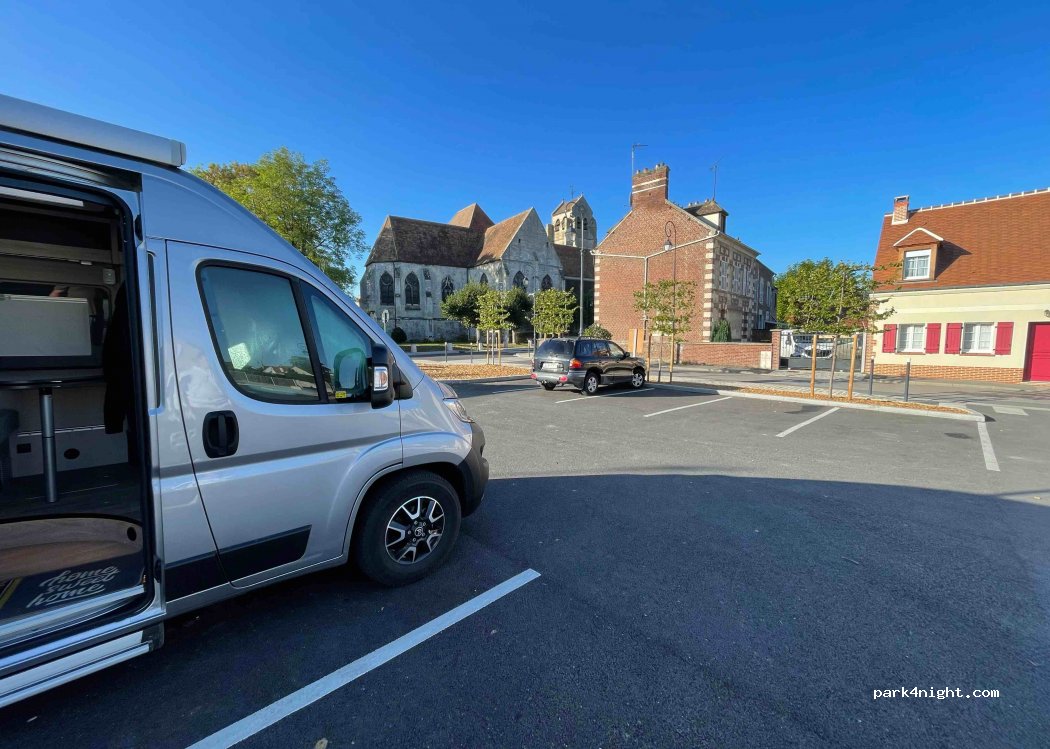Parking near the church, without service but really peaceful for one night. Town center nearby