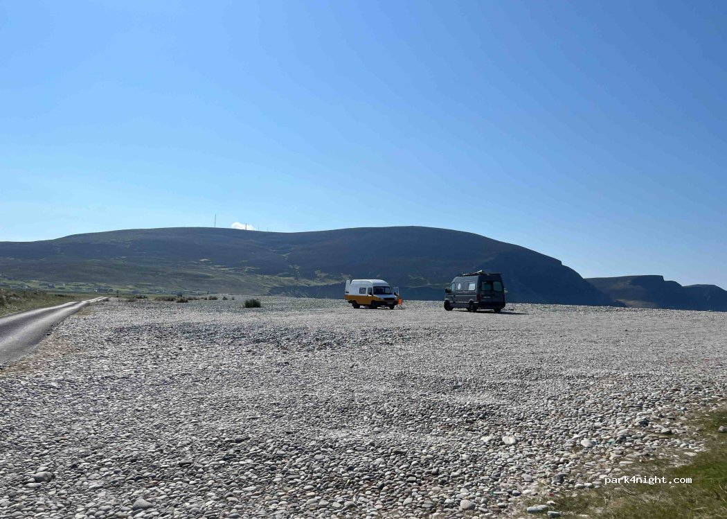 Schöner Platz für mehrere Camper an einem Kiesstrand mit Blick über die Bucht von Keel Strand. Viele Surfer und Kitesurfer und verwandte Sportler kommen hierher. Kostenlose Übernachtung mit öffentlichen, guten und sauberen Toiletten zu Fuß erreichbar. Aufwachen mit Aussicht! Achten Sie auf die Kieselsteine: An einigen Stellen sind sie größer und Sie können stecken bleiben. Achten Sie auch auf starke Winde direkt an der Küste. Bei Hochwasser sind Sie etwa zehn Meter von der Flutlinie entfernt. Wir sind deshalb abgereist, als ein Sturm mit Windstärke 8 aufzog. Außerdem mehrere Surfschulen in der Nähe.