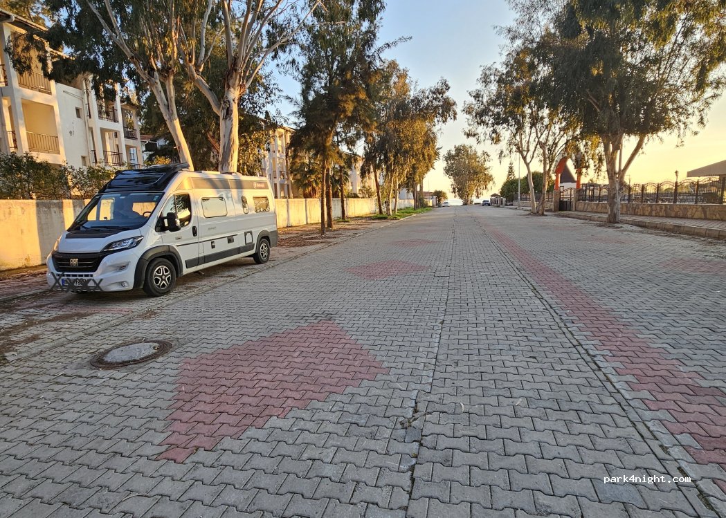 Straße zum Meer. In der Nebensaison ein ruhiger Spot. Zum Strand 200 Meter. Mülltonnen in der Nähe. Wir haben bewusst nicht vorne am Meer geparkt um uns einer ruhigen Nacht gewiss zu sein. Super für einen Strandtag.