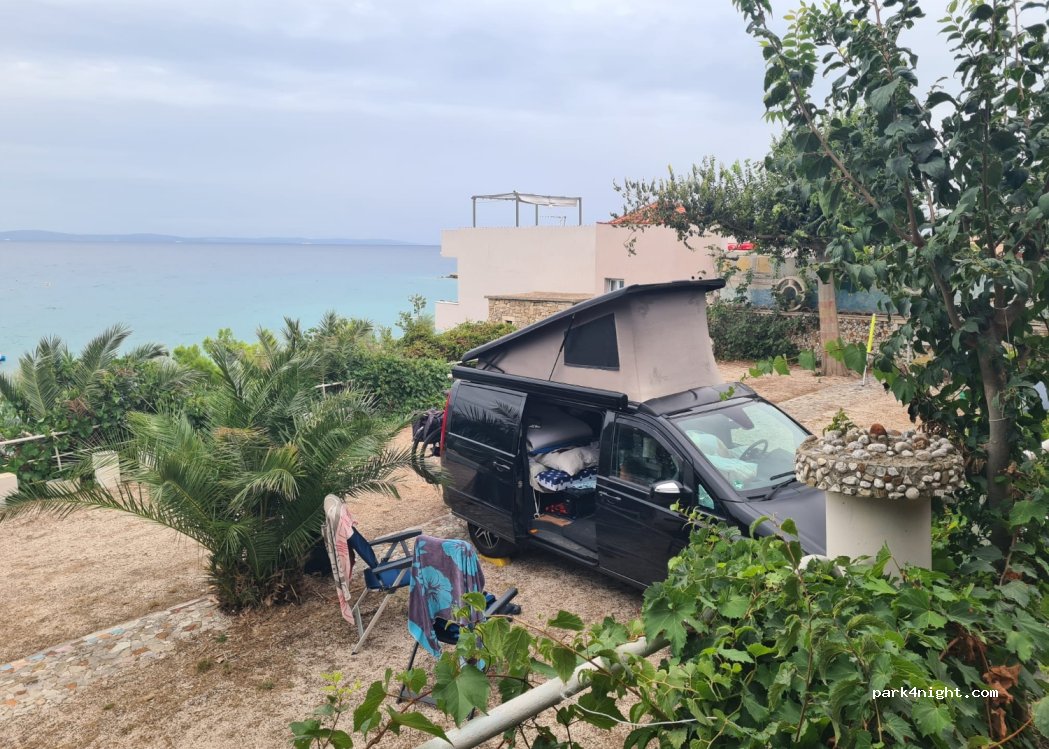 Platz mit Meerblick. Leider nahezu kein Schatten. Sanitäranlagen alt, aber OK. Leicht schräger Boden. Preis geht nach “Nasenfaktor”. Wir haben 40€ gezahlt, von den nächsten wurden 50€ verlangt.