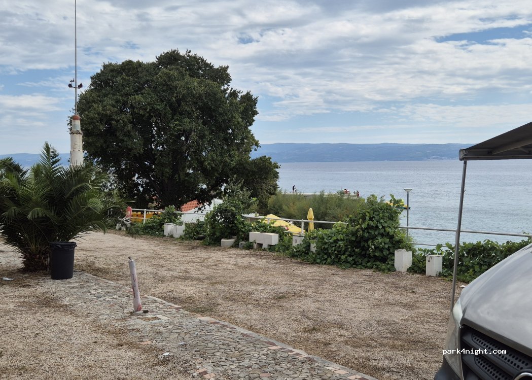 Convient effectivement qu'à des petits véhicules (vans) ou des tentes. Avantages: c'est à l'ombre toute la journée. Les toilettes sont propres. 30 min de bus jusqu'à Split. Supérette, boulangerie, resto et ATM à 5 min à pied. Plage juste en dessous : idéale avec enfants. Inconvénients : on entend pas mal la route assez passante. Pas Vraiment pratique pour se placer surtout si il y a "du monde".