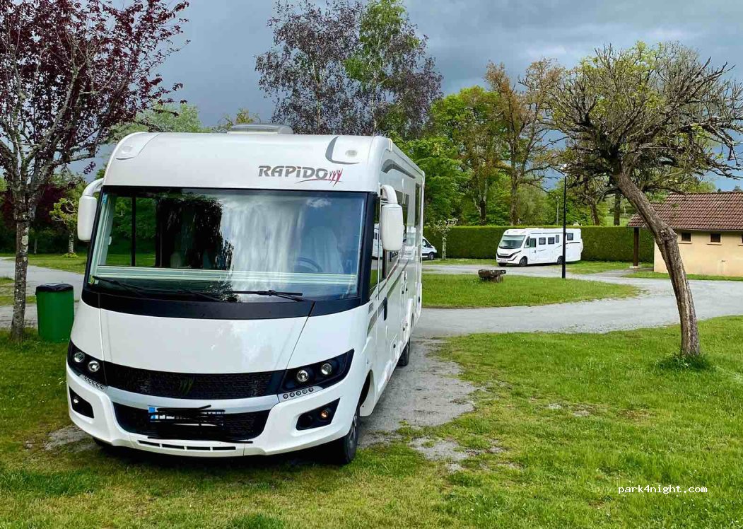 dans un ancien camping ,belle aire propre et agréable,bar , resto .pizza . coiffeuse à quelques metres dans un petit village très bien entretenu, pas dérangé par les chiens ,mais plutôt par des Vans wolkwagen qui ne respectent pas la charte du camping cariste.respecter les lieux .merci