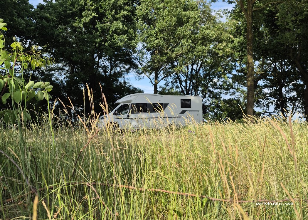 Parking right by the river. Space for two mobile homes. During the night some anglers come.