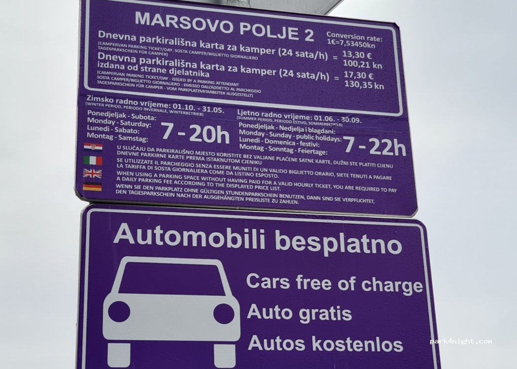 Parcheggio veramente sprecato!! Ottima posizione per visitare la città, facile da raggiungere e parcheggiare ma una fregatura assurda! Si pagano 24h di biglietto ma alle 22 il parcheggio chiude. Siamo andati in un altro parcheggio per la notte per evitare multe dagli agenti e poi siamo tornati per concludere le 24h e fare un altro giro in città. La Croazia non è camper friendly.