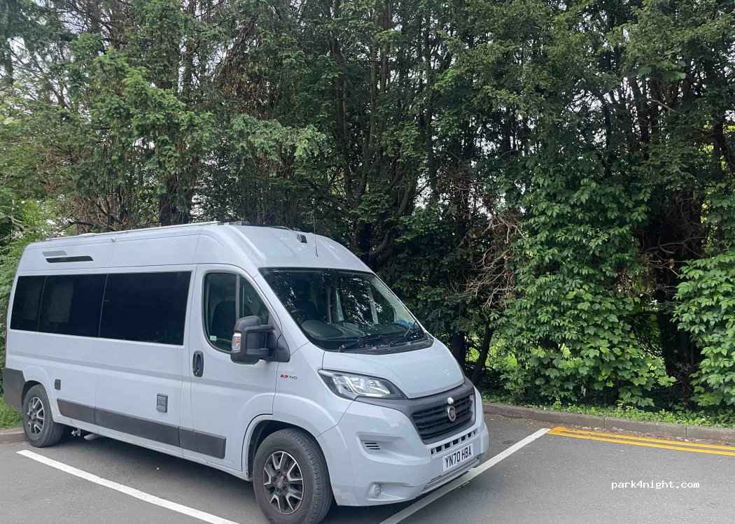 Kleinere Wohnmobile bis ca. 5.50m haben gut Platz, vorallem rechts. Es sind keine Anhänger oder Wohnwagen erlaubt. Platz ist recht eben. Am Sonntag morgen kann man bis 12h stehen bleiben. 30 Min. kosten 1£.