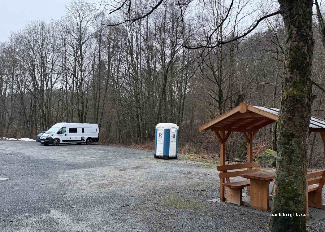 Es scheint wie ein Geheimtipp. Der kostenfreie Parkplatz ist weiträumig geschottert, groß, nicht ausdrücklich für Wohnmobile aber auch nicht verboten. Münz-WC's vorhanden. Wir sind bei dem verregneten Tag die einzigen Gäste hier. Die fließende Selbitz hört man gut, hat uns aber nicht gestört. Vielen Dank der Gemeinde, das es solche Plätze für schöne ausgeschilderte Wanderungen noch gibt.