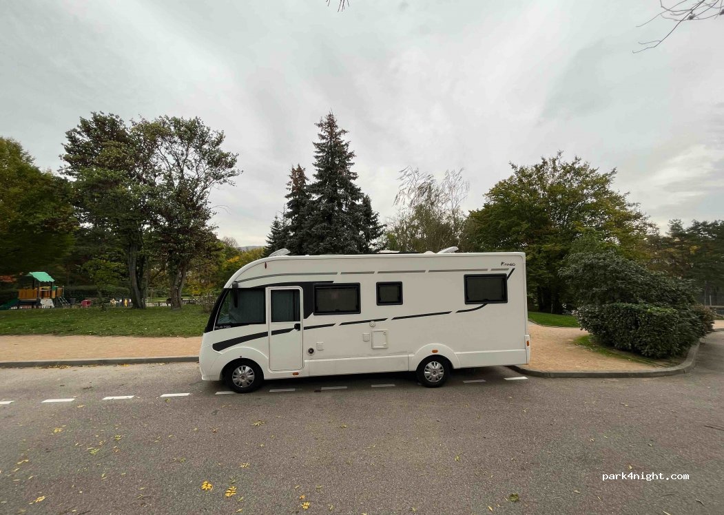 Es un aparcamiento al lado de un parque infantil. Bastante tranquilo. Hicimos una parada de 1h para comer y que los niños hicieran un poco el bruto. Supongo que por la tarde es más complicado aparcar. Tiene una minirotonda y hay que hacer maniobras para girar la autocaravana. Mejor entrar de cara y salir marcha atrás.