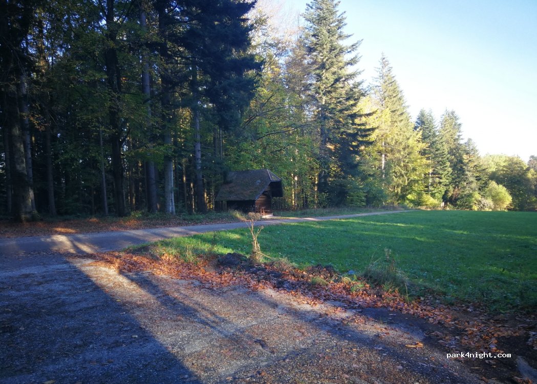 Leicht abfallende Freifläche zwischen Bäumen mit gedecktem Tisch. Wir blieben 1 Nacht. Es gab 1 anderes Auto. Einige andere Passanten gehen mit ihren Hunden spazieren. Am Morgen hörten wir Maschinen arbeiten.