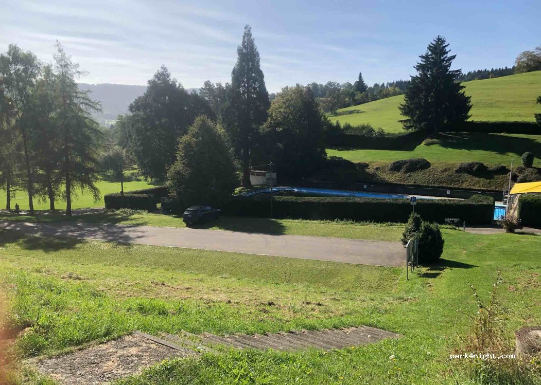 Parkplatz beim Schwimmbad, Spielplatz in der Nähe, Ausgangspunkt für Wanderung