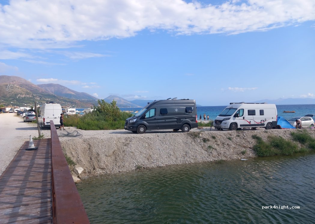 Parkplatz eines Strandrestaurants direkt am Kieselstrand. Stellplätze für circa zehn Camper. Eine Nacht mit Strom Dusche und grau Wasser Entsorgung für 10 Euro (1000Lek), inklusive zwei Sonnenliegen mit Schirm). Sehr freundliche Besitzer. Großes Bier und ein Wein für 500Lek. Der „Abwasserfluß“ ist garnicht so schlimm wie in manchen Beschreibungen. Für uns war es (sogar mit eigenem Hund) perfekt.