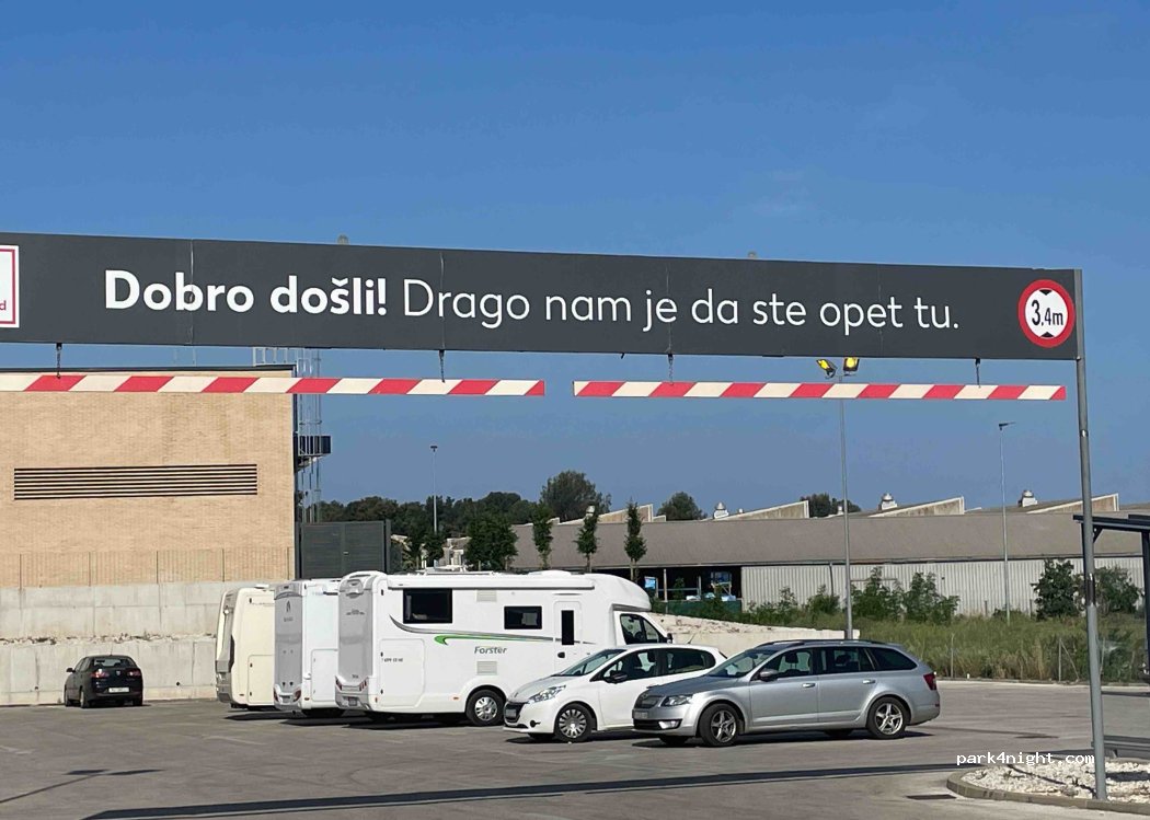 Oasis en Croacia. agradecer al súper que ceda parte de su aparcamiento a las autocaravanas de forma gratuita. Hago la compra en ese super como agradecimiento. En Croacia los precios son abusivos, el acoso de la policía devastador (100€ por persona, de multa).