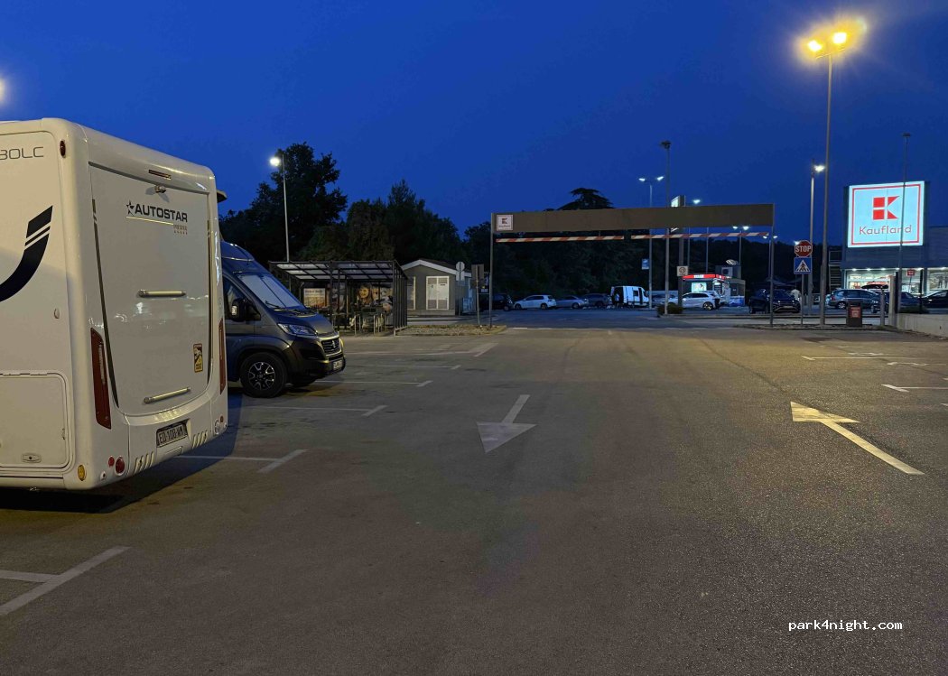 Ein sehr guter Parkplatz für eine Nacht. Einkaufen im Kaufland mit sehr gutem Sortiment. Im Anschluss liefen wir an der Hauptstraße eine viertel Stunde bis ins Stadtzentrum und verbrachten einen schönen Abend in Porec. Die Nacht verlief ruhig auf dem Platz. Zur Sicherheit sind an einem Haus nebenan mehrere Videokameras installiert.