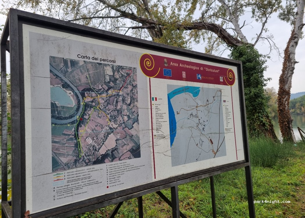 Ruhige Nacht an den Picknicktischen am Flussufer, die über einen Schotterweg erreichbar sind. 700 Meter vor dem Spot gibt es eine Wasserstelle mit Trinkwasser. Von hier aus können Sie zu Fuß zur archäologischen Stätte Ocriculum laufen.