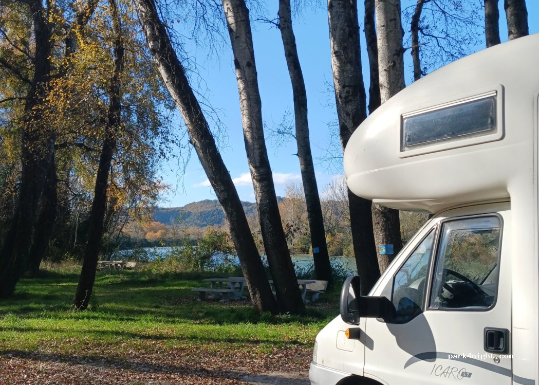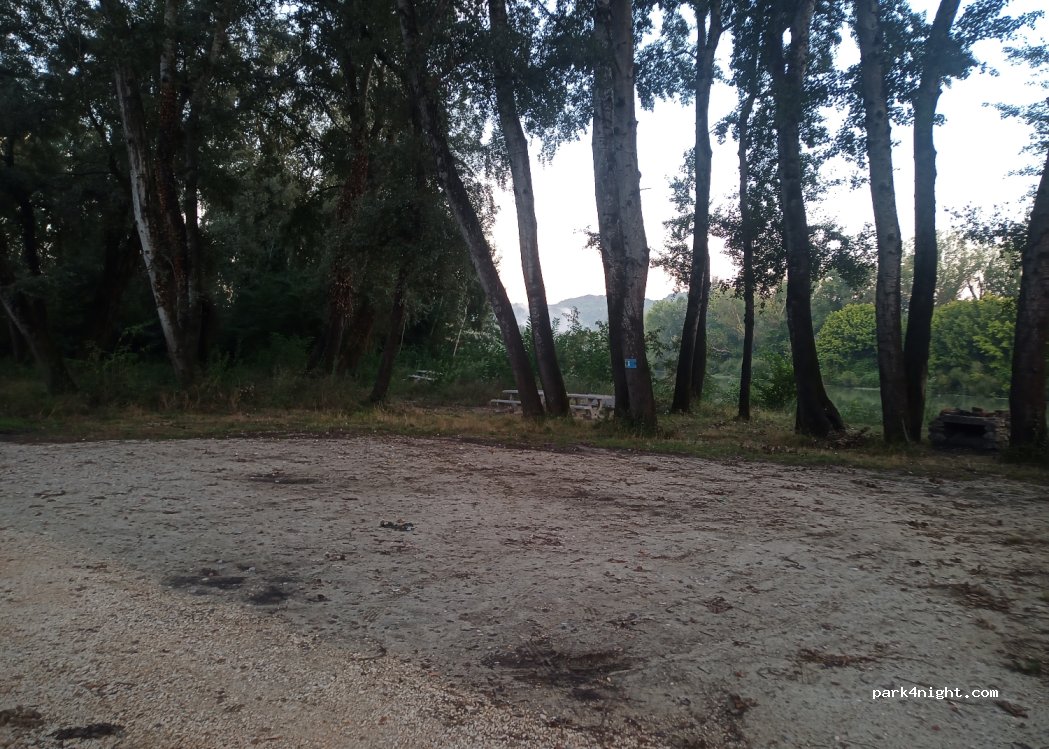 Noche tranquila en mesas de picnic junto al río al que se accede por un camino de grava. 700 metros antes del spot hay un punto de agua con agua potable. Puedes caminar desde aquí hasta el sitio arqueológico de Ocriculum.