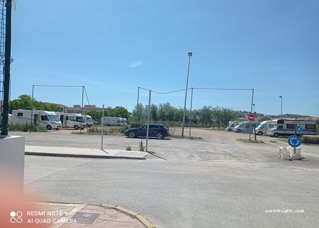 Gran explanada,suelo plano,al lado de polideportivo y parque para perros,mucha autocaravana.Sin servicios.Contenedor de basura sí hay.Al lado del camping.