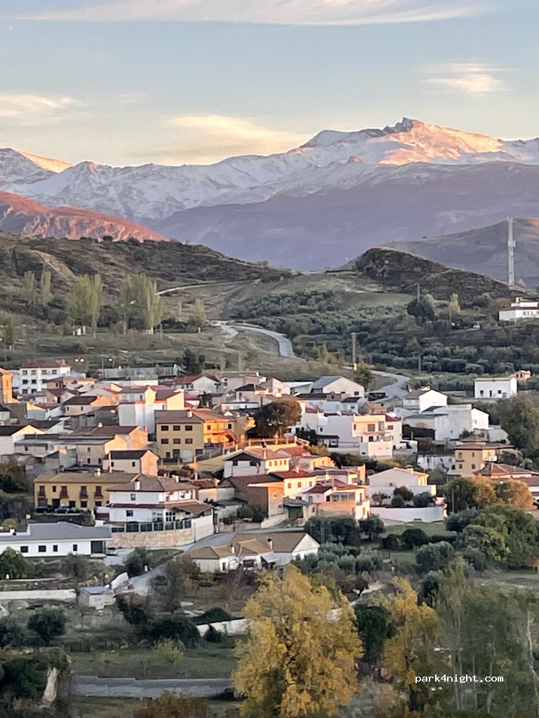 Área de autocaravanas dentro del pueblo y con vistas, cerca de Granada, muchas rutas de senderismo. Autobús al centro de Granada. Hay bastantes bares y restaurantes. Lo recomiendo.