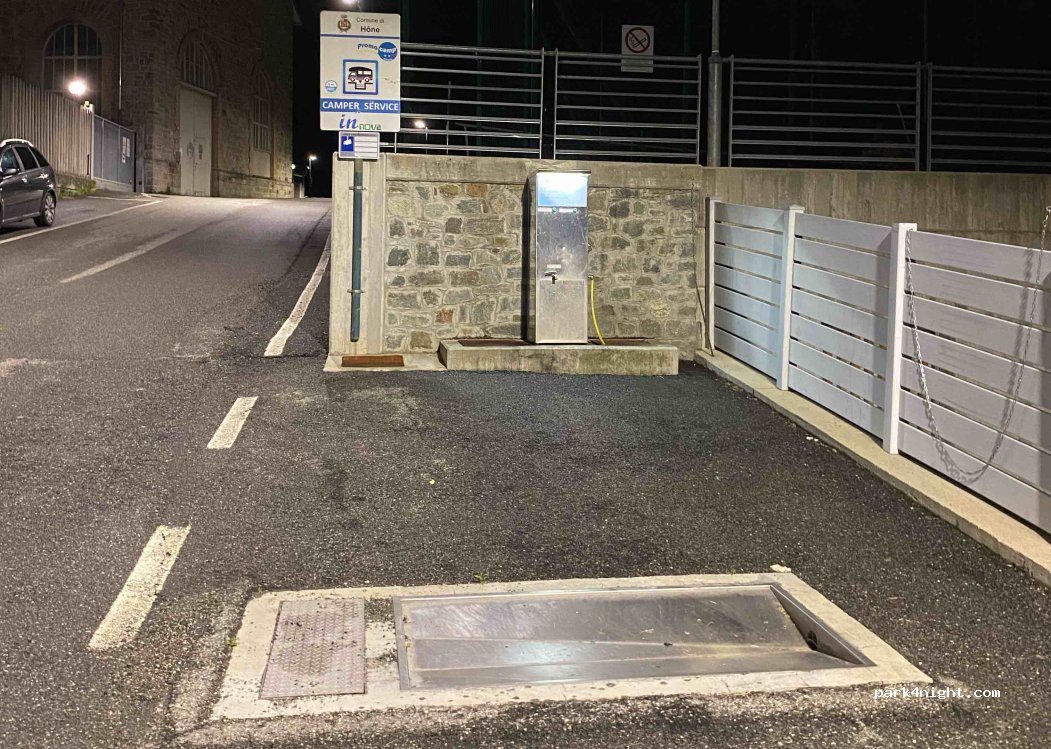 Sulla strada che porta all'area sosta a pagamento, dopo il ponticello, sulla destra, c'è una colonnina dei servizi del comune di Hone. Scarico nere/grigie e carico potabile gratuiti (era aperto anche con temperature sotto allo zero). Pulita e perfettamente funzionante.