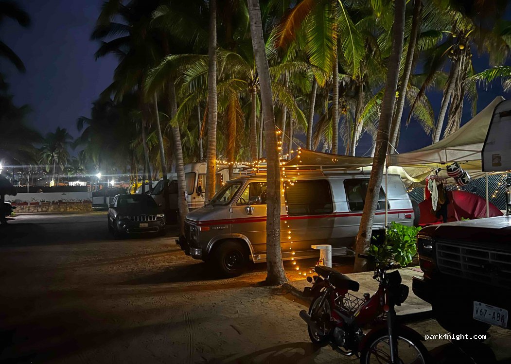 Camping à côté de la mer pour une trentaine de sites. 3 services ( eau, électricité 15 ampères vidange) Belles plages longues mais avec de grosses vagues. Restaurants. 12 km d’Acapulco