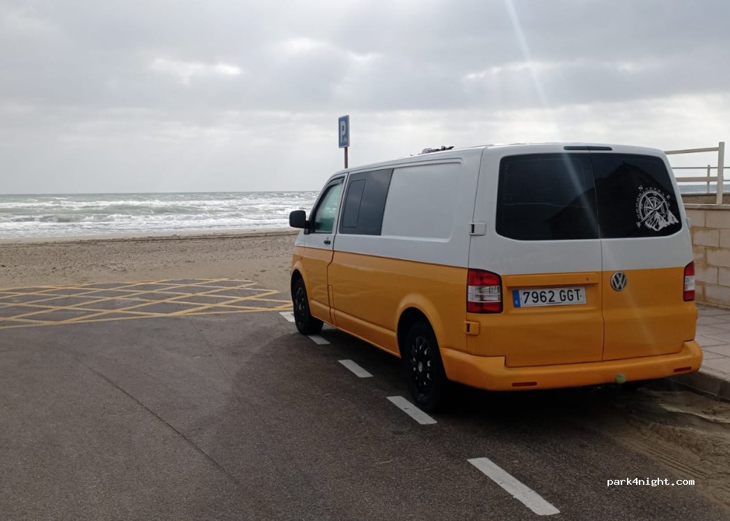 Hemos estado allí dos noches, sin ningún problema , incluso ha pasado la policía en varias ocasiones. Habían más autos aparcadas, cómodo para pasar unos días en la playa. Muy seguro y tranquilo. Hemos comido muy cerca en restaurante Bonobo, y sin duda volveremos. La única pega es que el camión de la basura pasa muy temprano y es un poco más ruidoso.